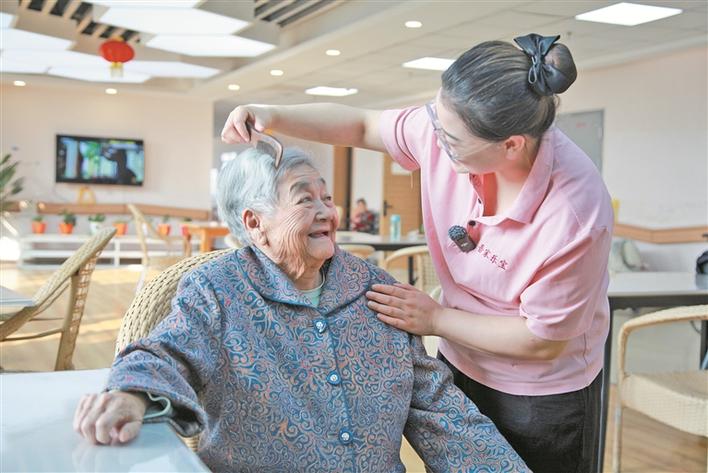 3月27日,在六师五家渠市吾家乐宝养老总院,护理员周芳弟(右)在为老人梳头发。杜仪 朱小丽 摄