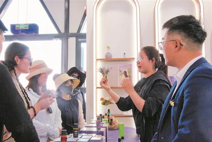 4月2日,在四师可克达拉薰衣草文化产业园伊帕尔汗产品厅,工作人员在给游客介绍香料产品。兵团日报常驻记者 李惠 通讯员 张祥 摄