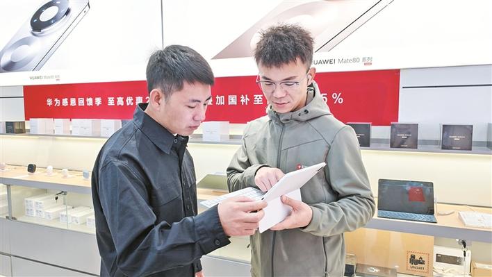 3月22日,店员(右)在二师铁门关市通讯专卖店为顾客介绍数码产品的功能及以旧换新补贴政策。周静静 摄