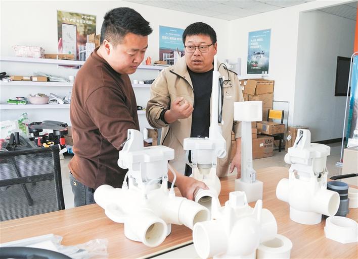 3月31日,在十师北屯市一家农机销售店内,店员正在为客户介绍智能电动水阀的作业原理。兵团日报常驻记者 李正虎 摄