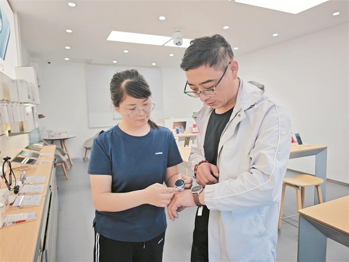 4月3日,在位于十二师三坪农场的华为专卖店,工作人员正在为顾客讲解智能手表如何实时监测心率、睡眠质量、运动数据等。兵团日报常驻记者 冯晓玲 摄