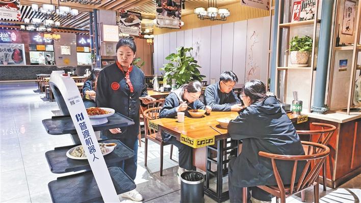 3月31日,在二师铁门关市博斯腾集团有限公司美好生活嘉悦酒店餐厅内,送餐机器人通过AI智能导航自动避障,将热腾腾的菜品精准送到顾客桌前,顾客只需扫码点餐,即可享受“机器人上菜”的便捷服务。周静静 摄