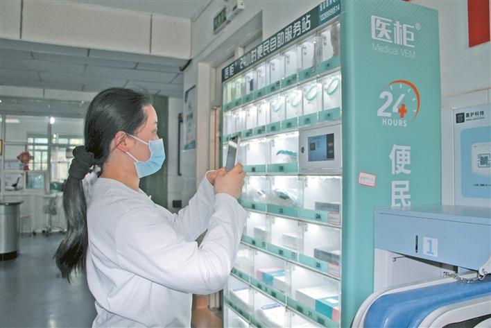 4月3日,一位前来就医的市民在五师医院外科楼的一处自助医柜前购买术后护理用品。兵团日报常驻记者 郭晓维 通讯员 杨晓坤 摄