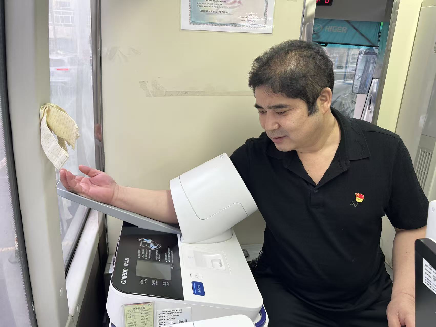 王斌和测血压,检查身体为献血做准备。梁艳 摄