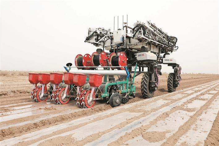 4月10日,一师二团二十六连农田里,一台由觉物科技(深圳)有限公司研发的FR鹤出T3000播种机器人在播种棉花。该播种机器人适用多种地形,能高效完成铺膜、铺滴灌带、播种、覆土等工序。近年来,一师阿拉尔市积极推广应用智能化、便捷化、国产化农业科技装备,以科技赋能农业生产,助力丰产丰收。陈健生 摄