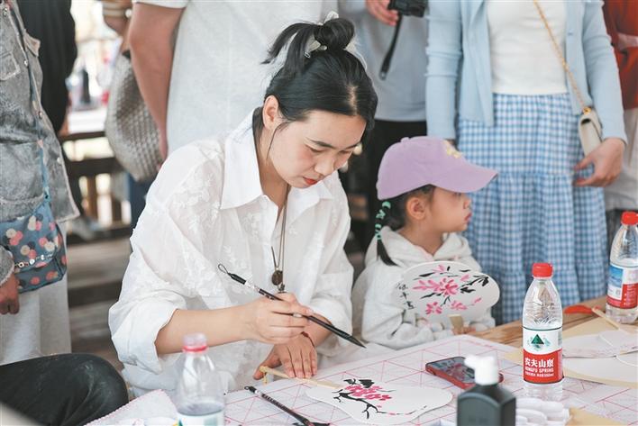 4月6日,2026年“美丽乡村 梨花有约”春季赏梨花文化活动现场,一师阿拉尔市美术家协会会员孟银平(左)在为游客绘制非遗扇面。 王岩亭 摄
