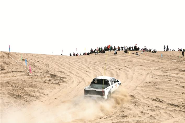 4月6日,“新疆华创”杯越野拉力趣味友谊赛现场,赛车奋力攀爬沙丘。申玲 摄