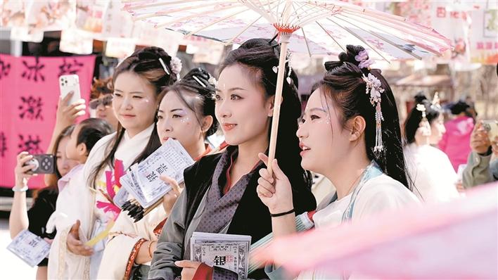 4月2日,“杏韵新星 春日雅集”十三师新星市东疆夏宫·庙儿沟文旅宣传推广体验季活动现场,身着汉服的互动演员成为一道亮丽的风景线。韩冰洁 摄