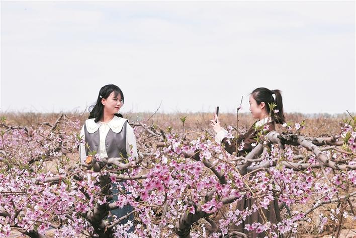 4月14日,六师一〇五团千亩桃花园内,游客在桃园赏花留影。兵团日报常驻记者 李华北 摄