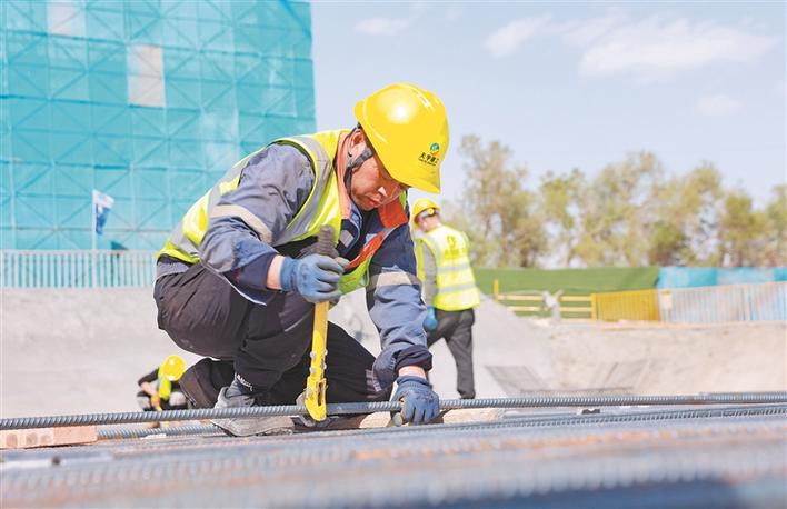 4月15日,二师铁门关市污水厂提标改造民生项目建设现场,工人进行钢筋绑扎作业。该项目为二师铁门关市重点民生工程,完工后将持续完善城市基础设施,提升民生保障能力。兵团日报常驻记者 魏承亿 通讯员 苟江 摄
