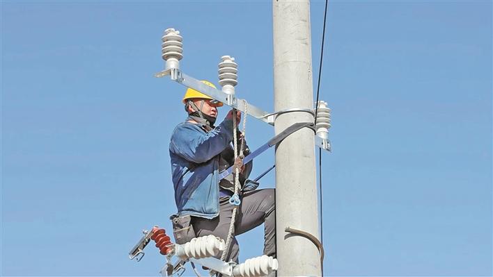 五师双河市高标准农田建设项目(施工三标)农田配电工程施工现场,施工人员登杆开展电力设施安装作业(摄于3月25日)。杨川川 摄