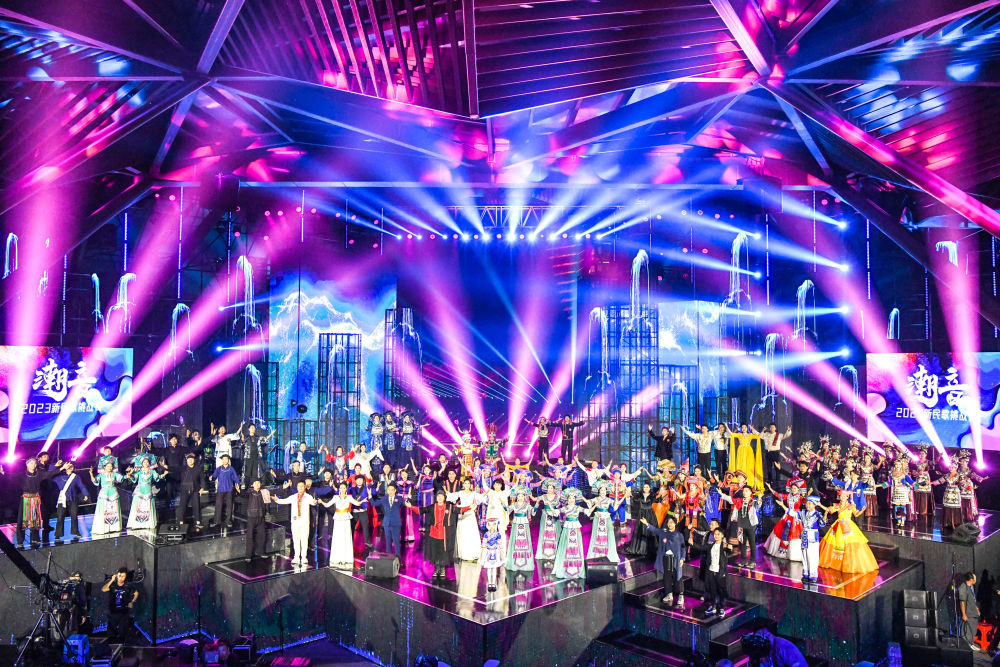 这是2023年5月9日在广西南宁园博园演艺中心拍摄的“潮音·2023新民歌挑战赛”总决赛比赛现场。作为2023年“壮族三月三·八桂嘉年华”的重要活动之一,此次比赛吸引了来自国内外1500多组选手报名参赛,收到各类新民歌作品1608件,有效丰富了广西特色的民歌文化。