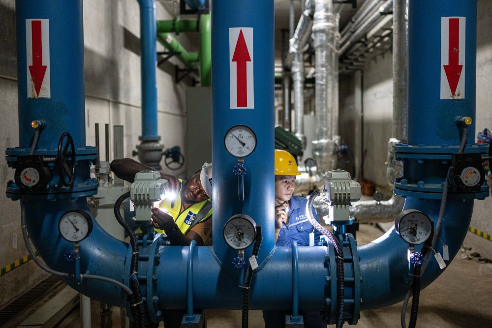 2025年4月24日,在几内亚杜布雷卡省,中几技术人员在凯乐塔水电站的水车室内检查设备运行状况。据统计,凯乐塔水电站项目施工高峰期为当地提供了1500多个工作岗位。自2016年起的项目运维阶段,企业与几内亚政府合作,公开选拔近百名几内亚学员赴华或进入当地高校学习,为该国培养了一批水电专业技术人才,如今他们已经成为几内亚国家电力系统的中坚力量。