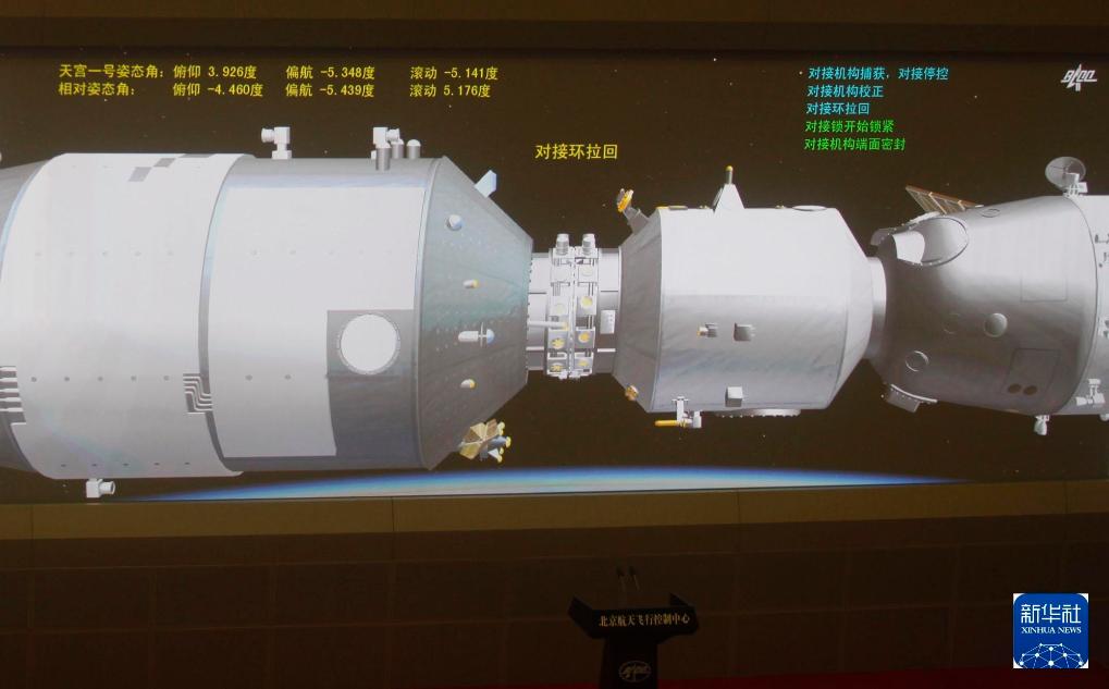 2011年11月14日,神舟八号飞船与天宫一号第二次对接成功。这是北京航天飞行控制中心屏幕上模拟对接的画面。新华社记者 王建民 摄
