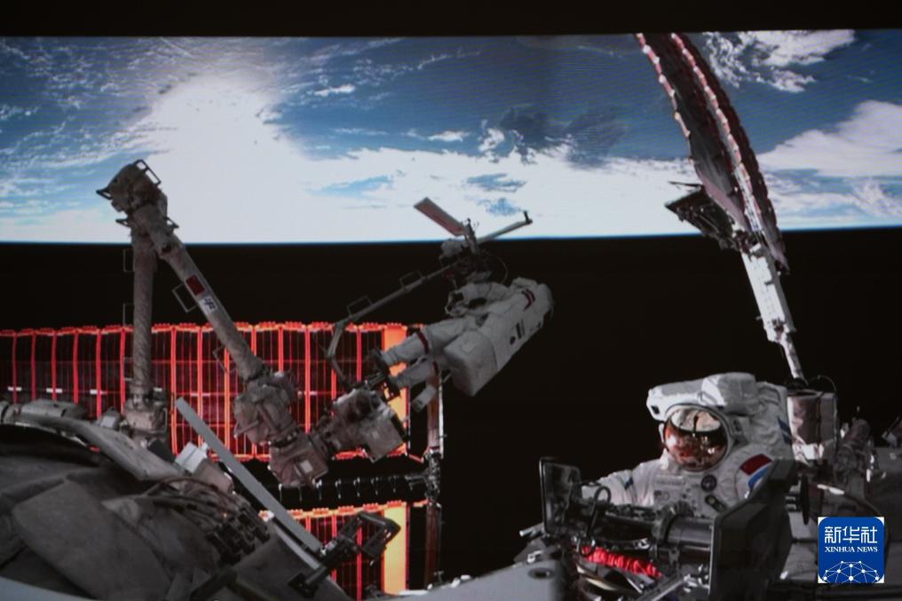 2024年5月28日在北京航天飞行控制中心拍摄的神舟十八号航天员叶光富在空间站组合体舱外作业的画面。新华社记者 李杰 摄