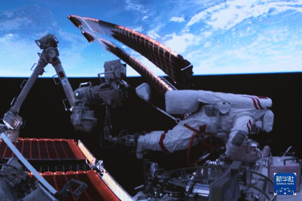 这是2026年4月16日在北京航天飞行控制中心屏幕上拍摄的神舟二十一号乘组航天员武飞在舱外工作的画面。4月17日01时36分,经过约5.5小时的出舱活动,神舟二十一号乘组航天员张陆、武飞、张洪章密切协同,在空间站机械臂和地面科研人员的配合支持下,圆满完成空间碎片防护装置安装、舱外设备设施巡检等任务。出舱航天员张陆、武飞已安全返回问天实验舱,出舱活动取得圆满成功。新华社发(张帆 摄)