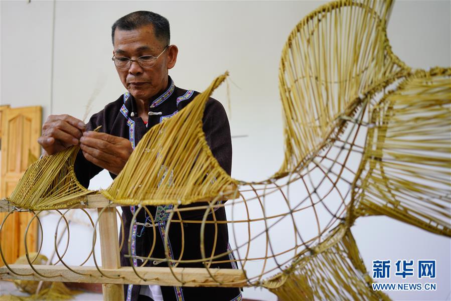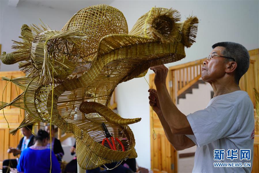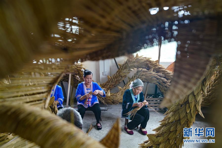 在广西龙胜各族自治县平等镇广南侗寨,村民在编织草龙(6月9日摄)。新华社发(黄勇丹 摄)