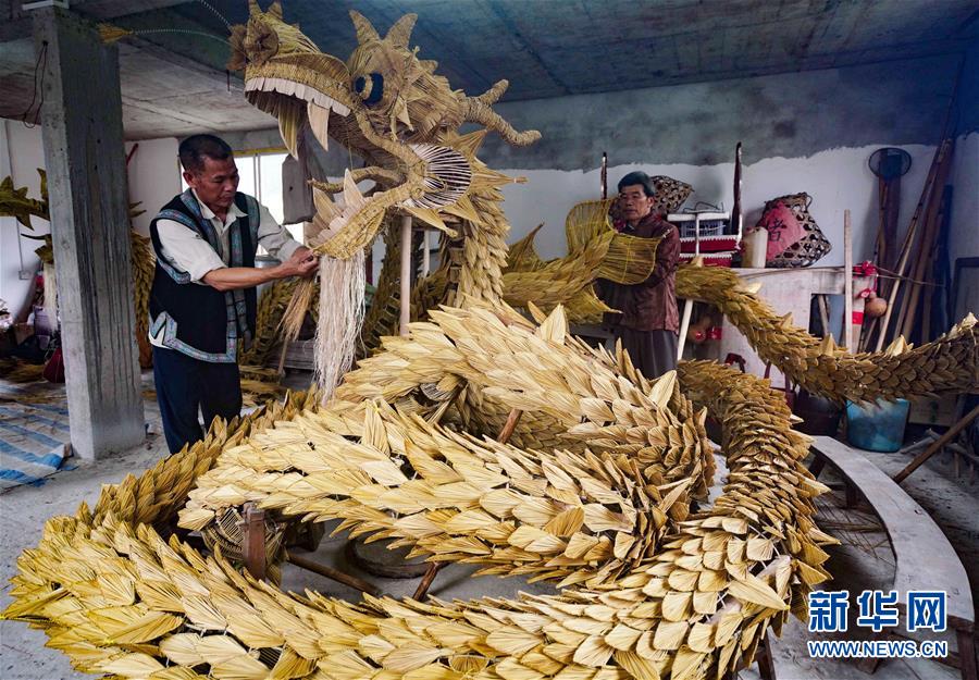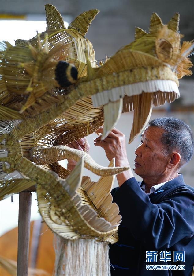 6月23日,在广西龙胜各族自治县平等镇广南侗寨,村民在整理刚刚编织好的草龙。 端午节临近,在广西龙胜各族自治县平等镇广南侗寨,侗族同胞赶制草龙迎接传统佳节。编织草龙是当地侗族一项独特的民间技艺,每逢重大节庆,侗族同胞都有舞草龙祈福的习俗。草龙以稻草为主要材料,辅以竹木做支架,采用编、插、嵌、剔、镂等十多种工艺,整条草龙用100多斤、数万根稻草编成,做工精细,惟妙惟肖。 新华社发(黄勇丹 摄)