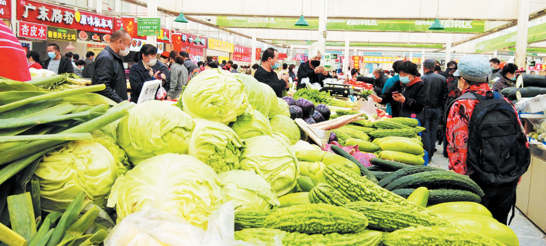 市民在石河子市益群集贸综合市场选购新鲜蔬菜。 兵团日报常驻记者 张德智 摄