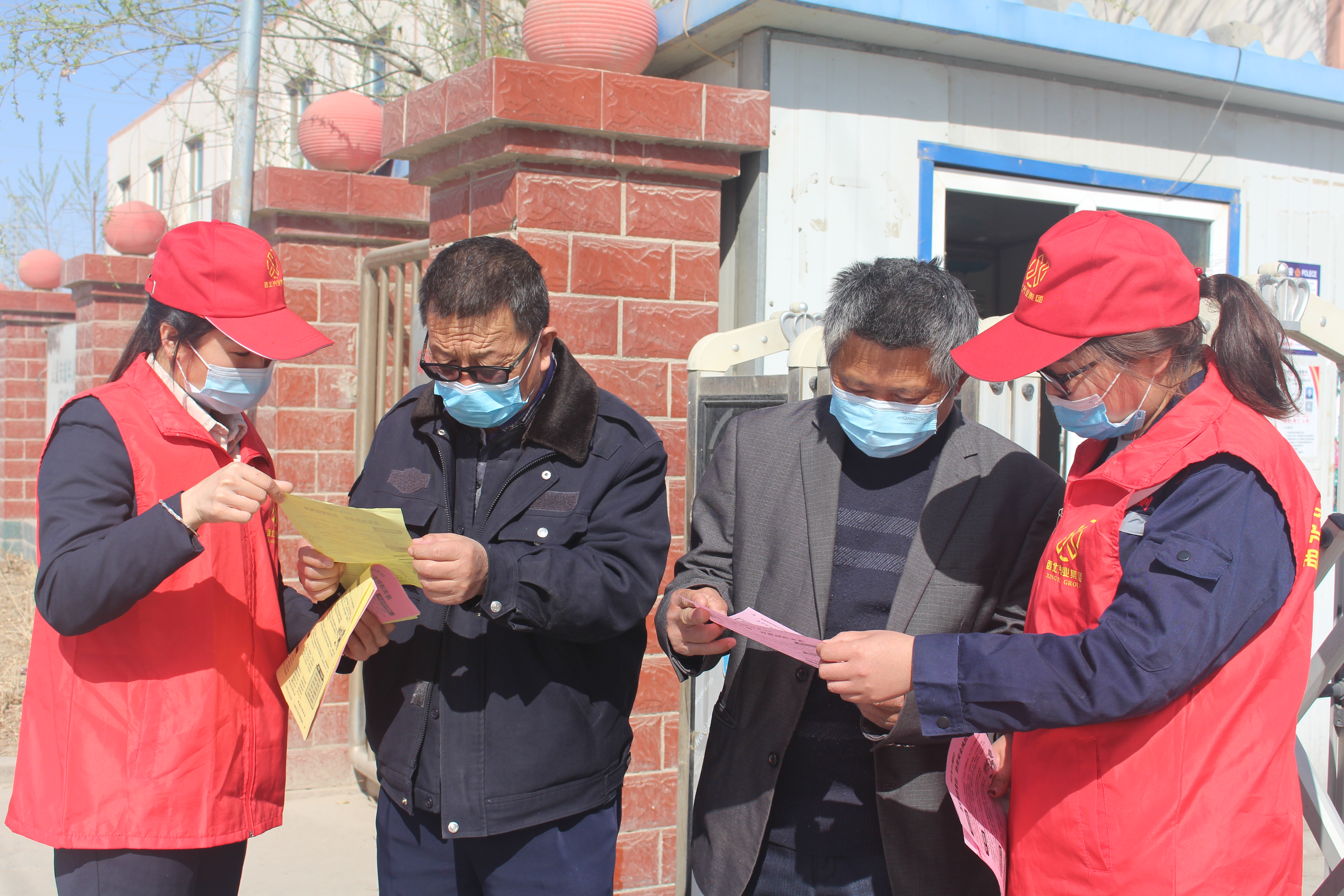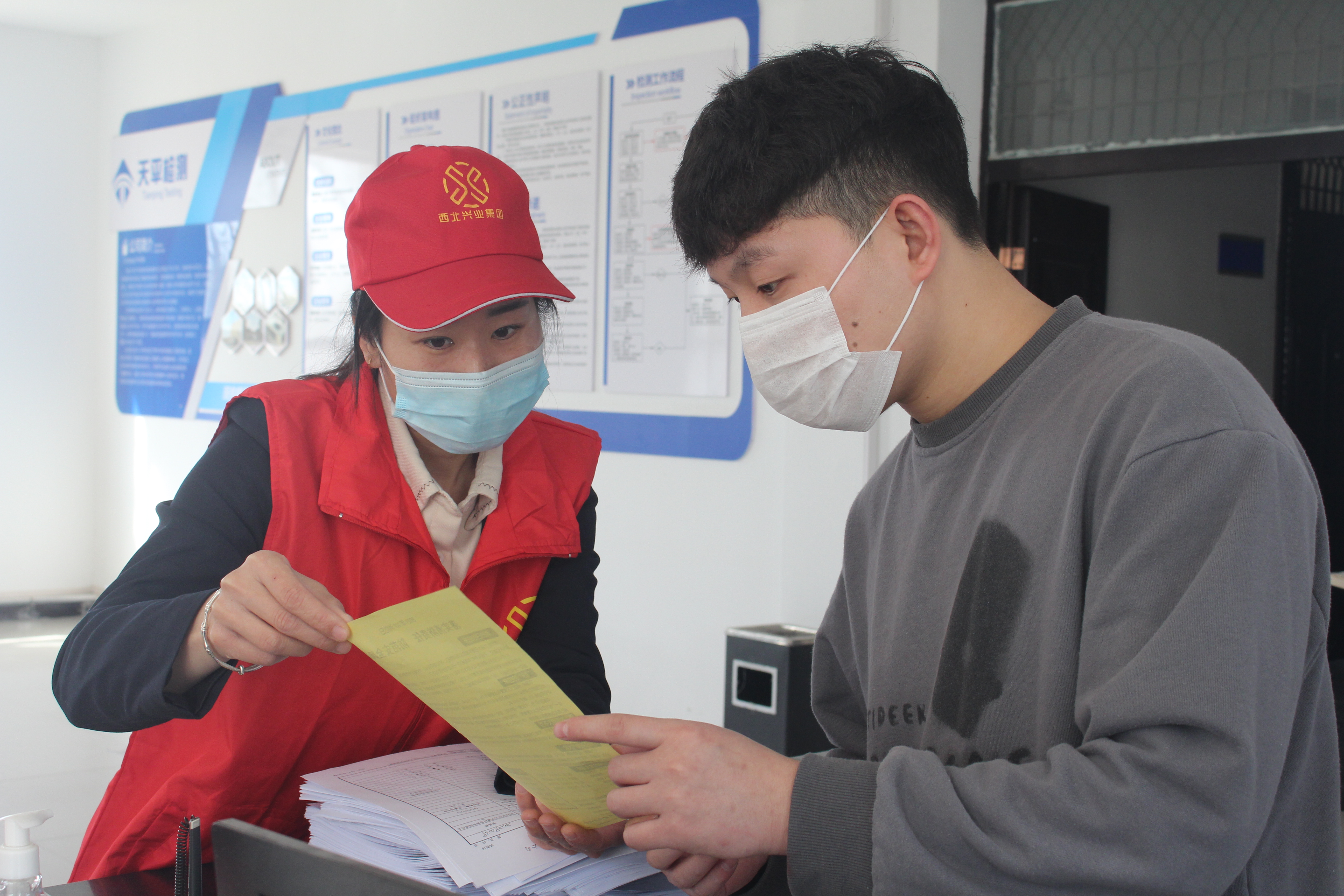 志愿者向员工宣传消防安全知识。