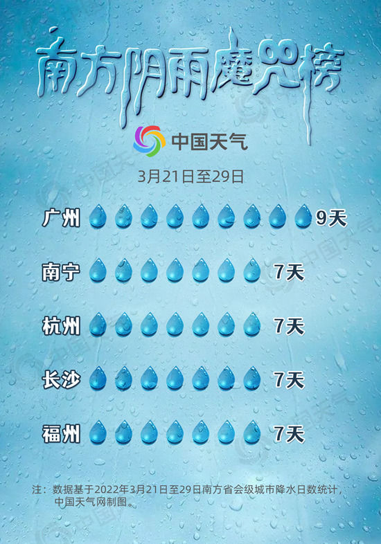3月下旬以来,南方雨水频繁打卡,中国天气网大数据显示,省会级城市中,广州雨水“满勤”,21日至29日每天都出现了降雨,其次南宁、杭州、长沙、福州3月下旬降雨日数也都达到了7天。正是由于广东大范围的频繁阴雨,也让今年的华南前汛期提前开启。