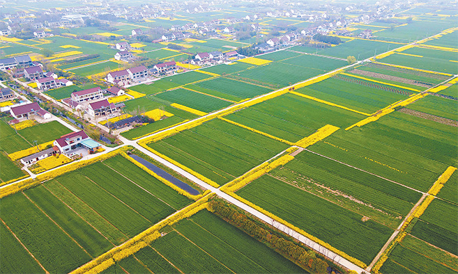 春耕时节,农机嗡嗡,春水汩汩,白鹭翩飞。由南向北,一行行稻秧逐渐栽满水田,冬油菜开始结荚长粒,麦苗陆续起身拔节、孕穗。