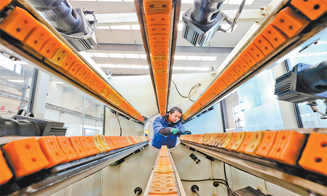 甘肃省张掖市民乐工业园区,工作人员正在检查农田高效节水管材的生产情况,全力做好备耕工作。 王将 摄(影像中国)