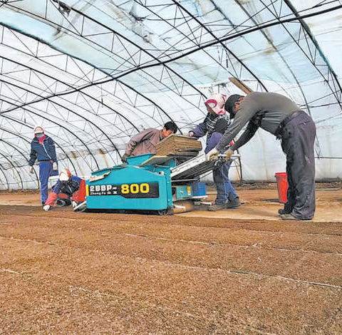4月14日,吉林省各市州实现疫情防控社会面清零目标。春耕时节,全省坚持“两手抓”,疫情防控不松劲,农业生产不误时。图为龙井市智新镇村民通过轨道车等设备进行水稻育秧作业。 郑智文、孙可 摄影报道