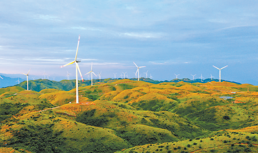 湖南省桂东县,分布于山岭之间的风电机组提供了源源不断的绿电。 邓焱萍 摄(影像中国)