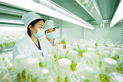 河北省邢台市蔬菜种子公司育种实验室,农艺师查看幼苗的生长情况。 田晓丽 摄(人民视觉)