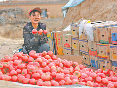 宁夏回族自治区吴忠市盐池县城西滩种植基地,村民正在打包刚刚采摘的西红柿。 蔡生燕 摄(人民视觉)