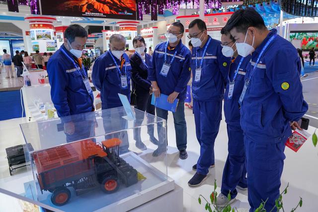 9月21日,在第七届中国-亚欧博览会上,参观者在乌鲁木齐展位了解新疆生产的智能采棉机。新华社记者丁磊 摄