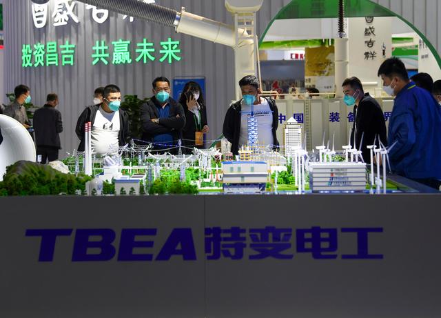 9月20日,在第七届中国-亚欧博览会特变电工展位,参观者在了解输变电设备。新华社记者赵戈 摄