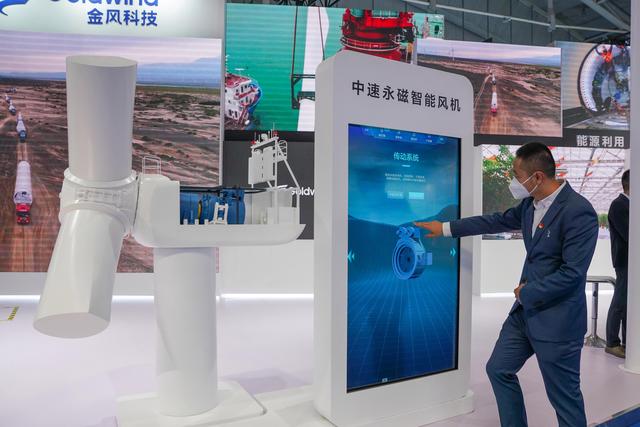 9月21日,在第七届中国-亚欧博览会上,新疆金风科技股份有限公司展位的工作人员在介绍中速永磁智能风机。新华社记者 丁磊 摄
