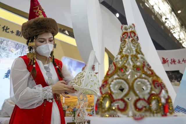 9月21日,在第七届中国-亚欧博览会上,“新疆是个好地方”展位的工作人员在整理哈萨克族花帽。新华社记者丁磊 摄