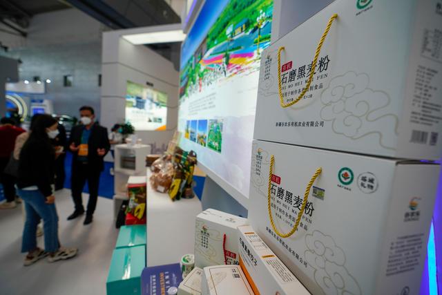 9月20日,在第七届中国-亚欧博览会新疆塔城地区展位,参观者在了解当地生产的农副产品。新华社记者赵戈 摄