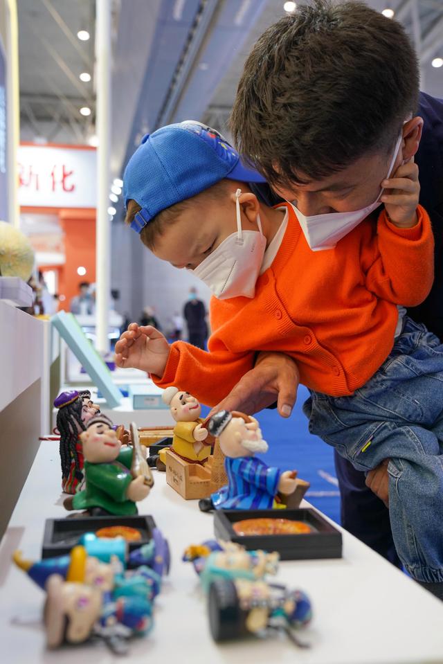 9月21日,在第七届中国-亚欧博览会上,参观者在观赏富有新疆特色的手工艺品。新华社记者丁磊 摄