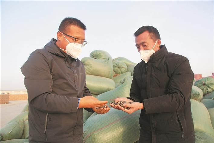 12月13日,先新良(右)向二师三十八团职工了解打瓜籽的销售情况。 严君峰 摄
