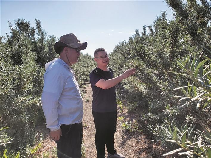 王军扬(右)向外来考察人员介绍团场种植沙棘的情况(资料图片)。王军扬 提供