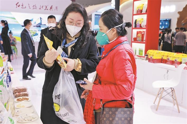 2022年12月30日,在第十八届文博会兵团展区,兵团参展商向游客介绍特色干果产品。