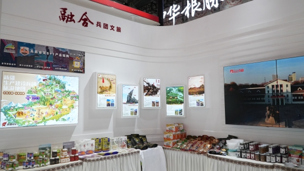 步入兵团展区,浓浓的红色文化气息扑面而来。展区以醒目的红色和素雅的白色为主基调,展馆整体设计简洁、大气,又极富创意。站在展区入口,顶部设计体现“一带一路”理念,空间设计突出“一体、多元、通透、便捷”,色彩及造型设计主要体现中华元素、红色文化、兵团精神等,展台上精美的文创产品令人眼花缭乱,大屏幕上兵团各师市的大美风光一览无遗。