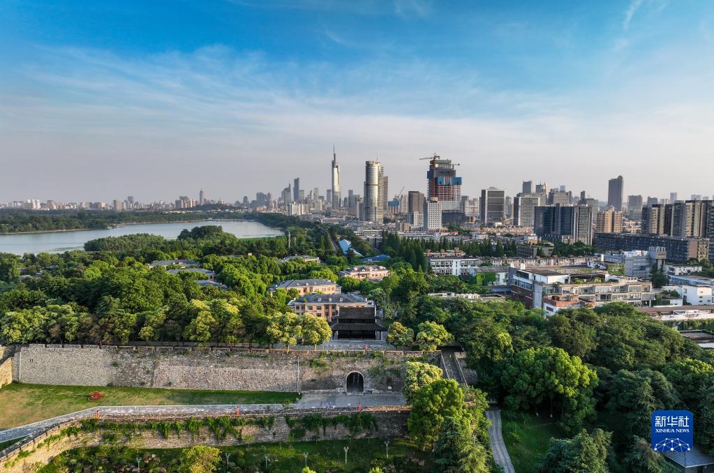 南京明城墙神策门、玄武湖与城市风光(6月9日摄,无人机照片)。新华社记者杨磊 摄
