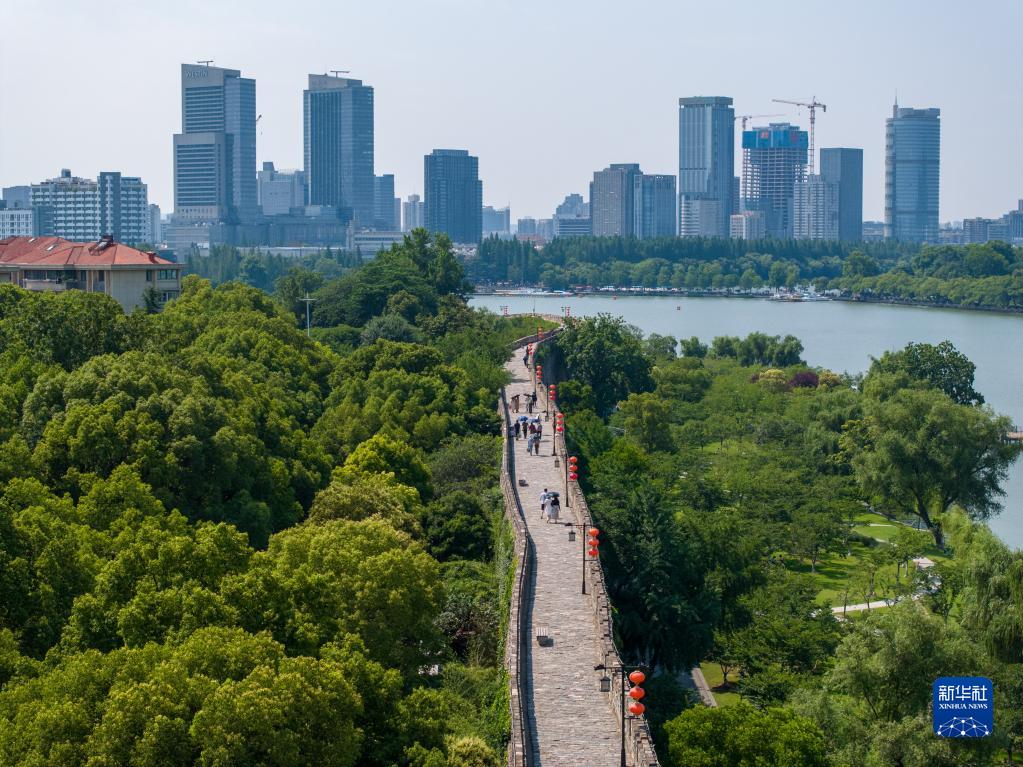 游客在南京城墙北线景区参观游玩(6月12日摄,无人机照片)。新华社记者李博 摄
