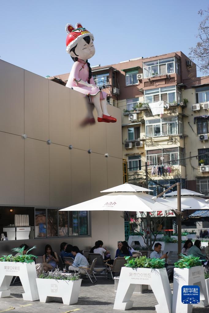 在位于玄武区的南京D9街区,市民在一家咖啡馆休闲放松(2022年4月8日摄)。D9街区是玄武区利用都市工业遗存打造的文旅消费项目。新华社记者季春鹏 摄
