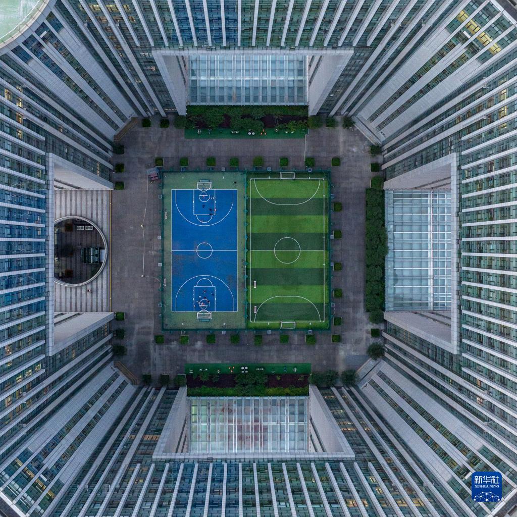市民在南京市建邺区一处建筑内设置的微型体育场内运动(6月13日摄,无人机照片)。新华社记者李博 摄