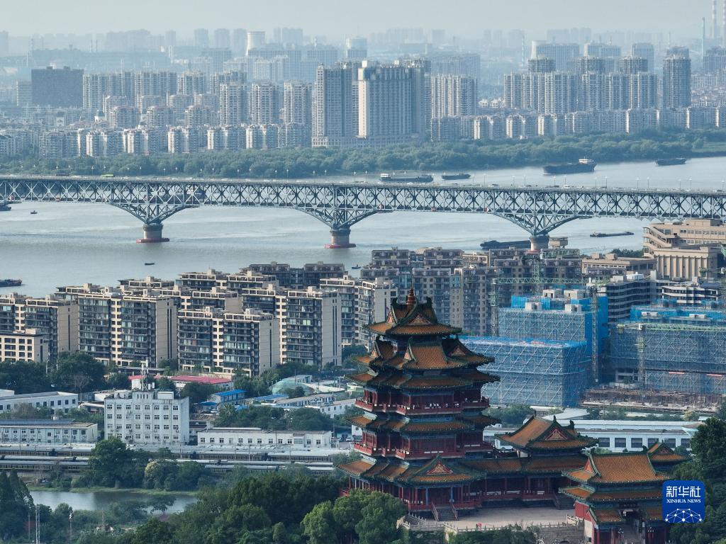 南京阅江楼与南京长江大桥(6月11日摄,无人机照片)。新华社记者季春鹏 摄