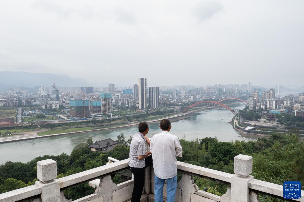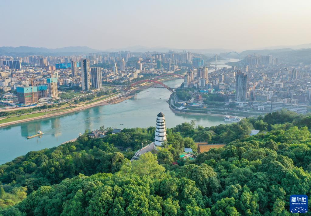 市民从白塔山俯瞰四川省宜宾市三江口(6月29日摄,无人机照片)。新华社记者江宏景 摄