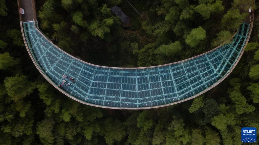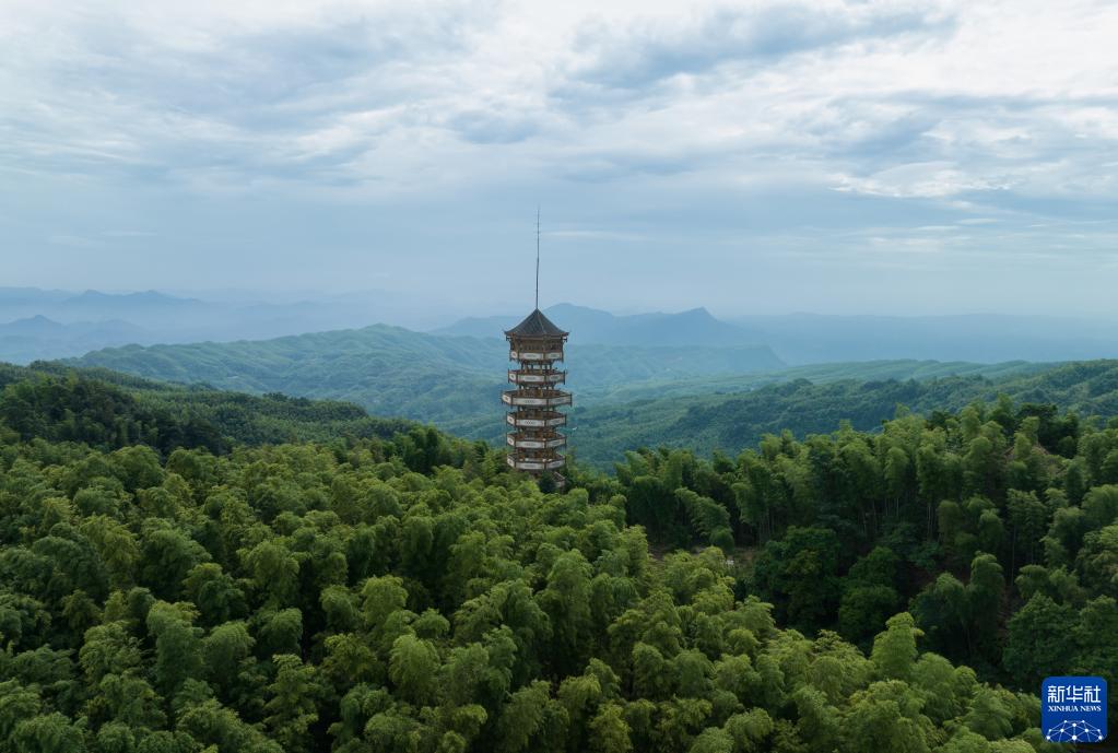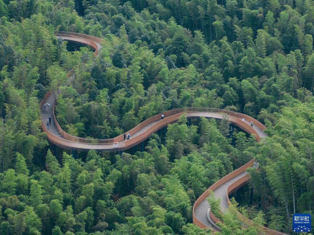 游客在四川省宜宾市蜀南竹海的竹尖漫步步行走廊上散步,享受绿意(6月30日摄,无人机照片)。新华社记者江宏景 摄