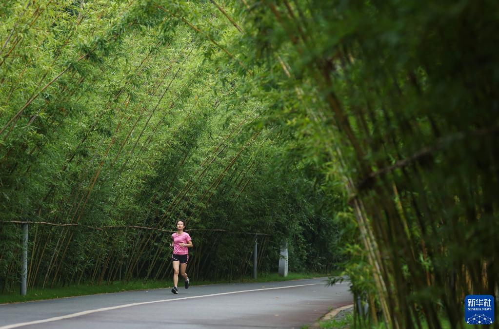 一位市民在四川省宜宾市江安县长江竹岛上跑步(6月30日摄)。新华社记者江宏景 摄