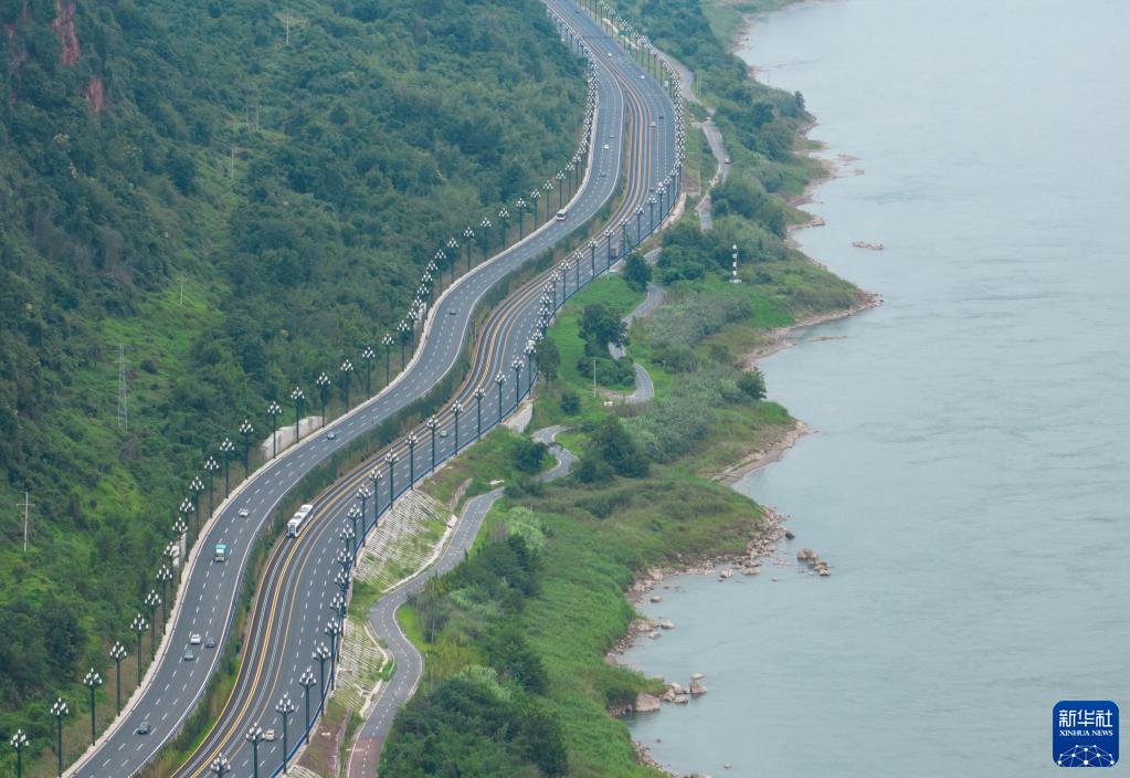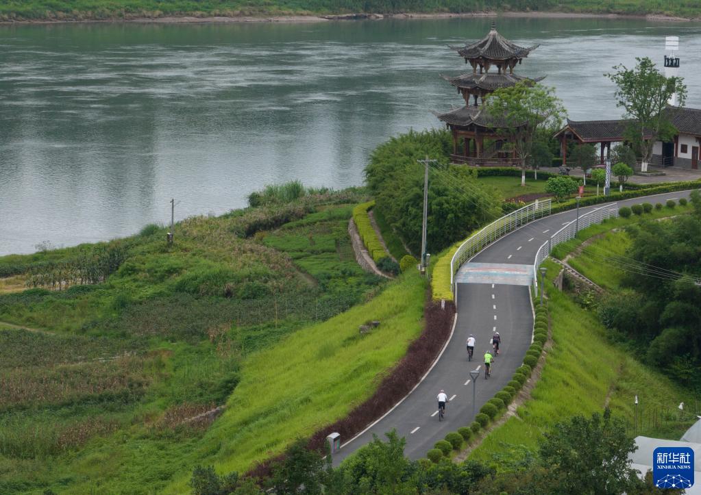 骑行爱好者骑行在长江环线绿道四川省宜宾市南溪区长江村段上(6月29日摄,无人机照片)。新华社记者江宏景 摄